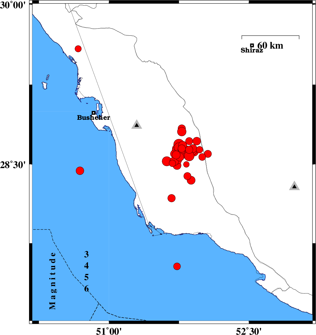 2013/04/09 | 11:52:50.4 | 16:22:50.4 | 28.48 | 51.59 | 20 | ML:6.2 | Bushehr Province, 29 km South-East of Khormog | ||