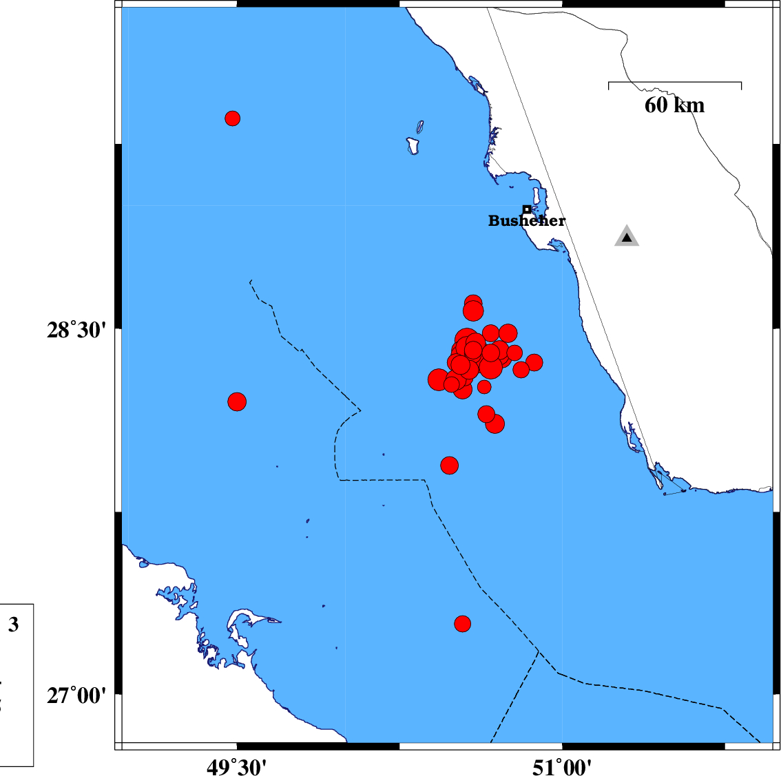 2013/04/09 | 19:51:36.4 | 00:21:36.4 | 28.4 | 51.52 | 28 | ML:3.5 | Bushehr Province, 32 km South-East of Khormog | ||
