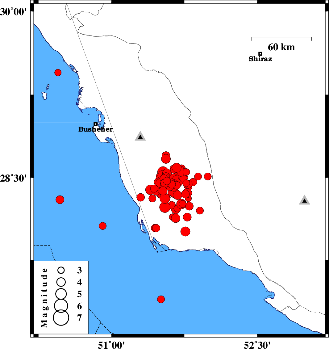 2013/04/10 19:41:57.5 00:11:57.5 28.4551.5530 ML:3.9 Bushehr Province, 28 km South-East of Khormog