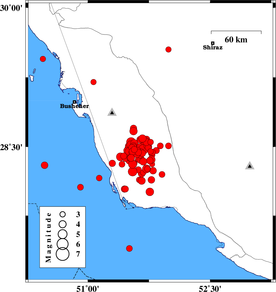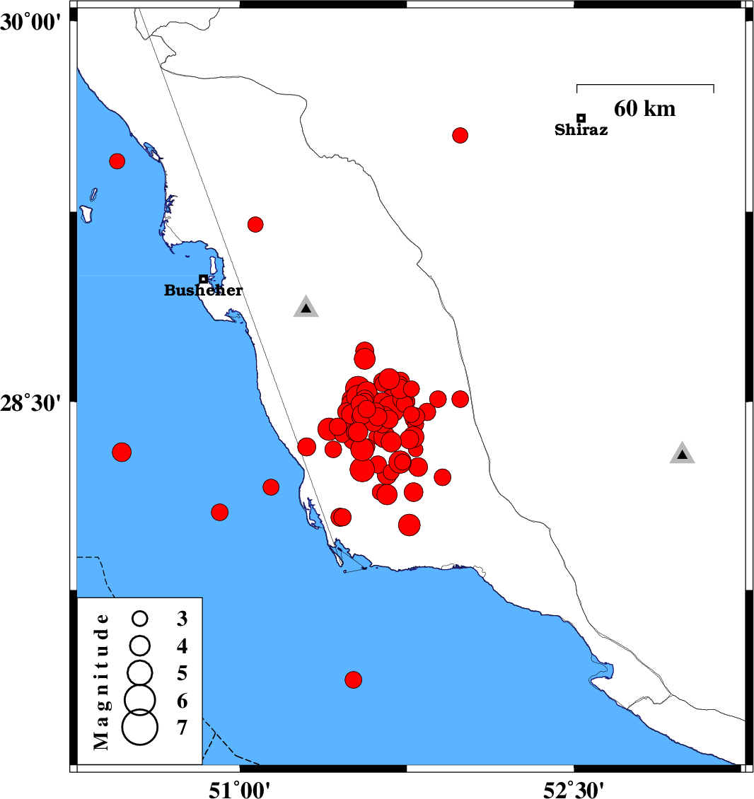 2013/04/10 19:41:57.5 00:11:57.5 28.4551.5530 ML:3.9 Bushehr Province, 28 km South-East of Khormog