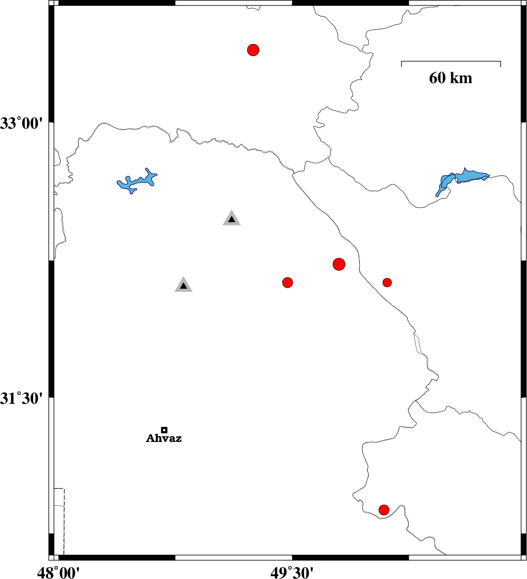 | 2013/04/05 | 20:01:30.1 | 00:31:30.1 | 30.88 | 50.09 | 15 | ML:3 | Kohkiluieh va boyerahmad Province, 35 km North-West of Behbahan | ||