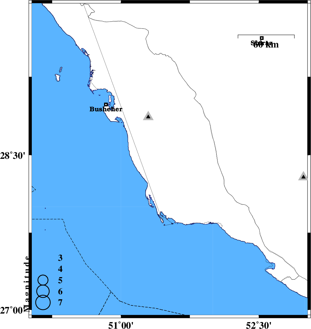 2013/04/09 | 11:52:50.4 | 16:22:50.4 | 28.48 | 51.59 | 20 | ML:6.2 | Bushehr Province, 29 km South-East of Khormog | ||