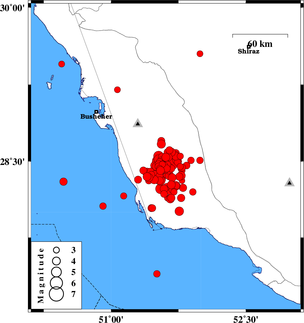 2013/04/10 19:41:57.5 00:11:57.5 28.4551.5530 ML:3.9 Bushehr Province, 28 km South-East of Khormog