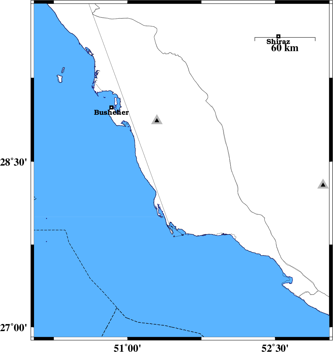 2013/04/09 | 11:52:50.4 | 16:22:50.4 | 28.48 | 51.59 | 20 | ML:6.2 | Bushehr Province, 29 km South-East of Khormog | ||