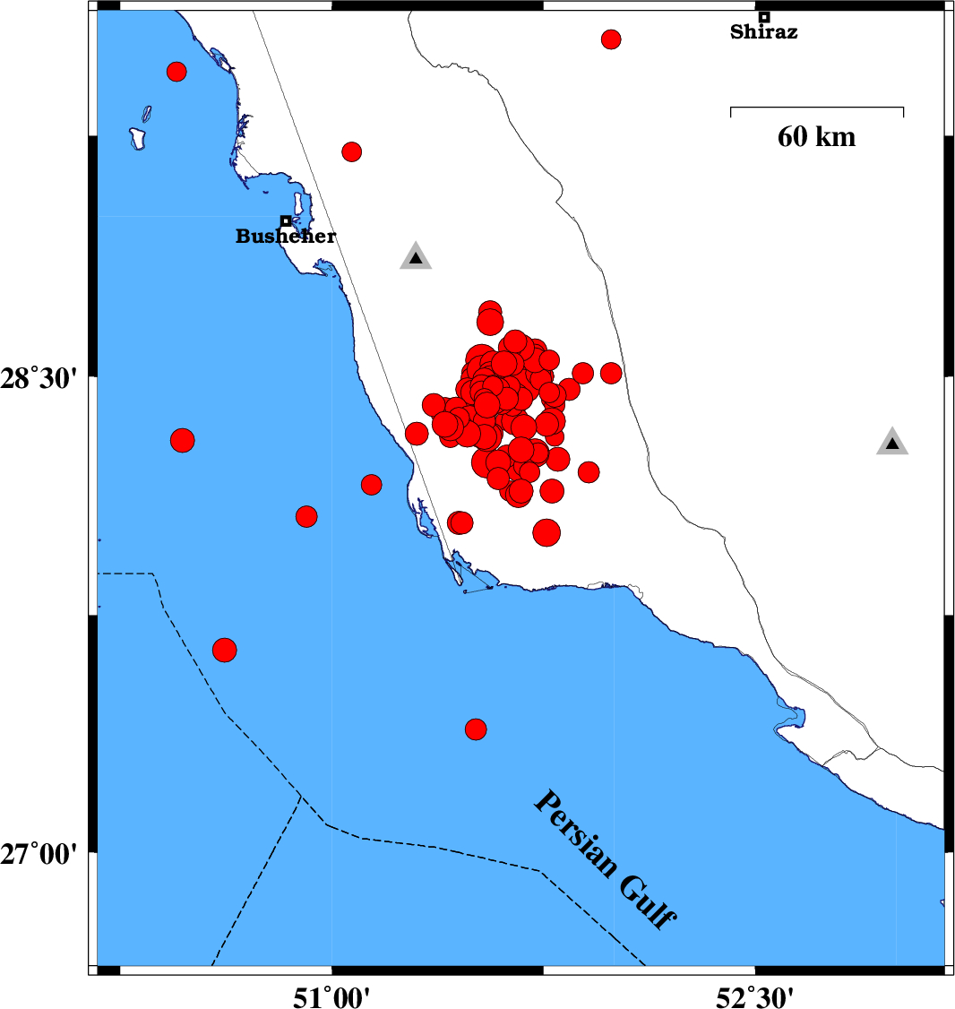 2013/04/10 | 09:10:58.7 | 13:40:58.7 | 28.46 | 51.61 | 14 | ML:3.6 | Bushehr Province, 32 km South-East of Khormog | ||