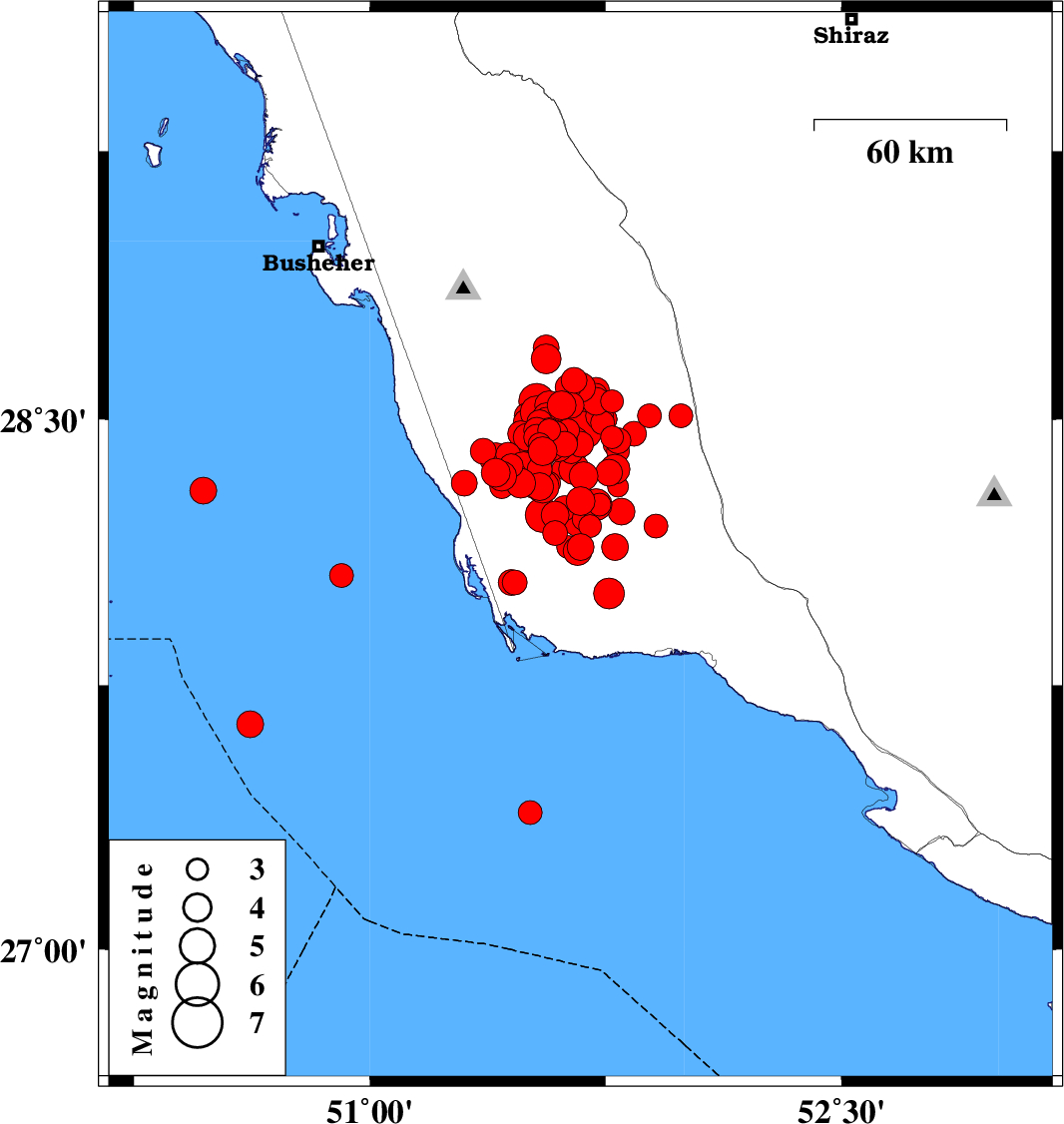 2013/04/09 | 12:05:41.5 | 16:35:41.5 | 28.55 | 51.53 | 36 | ML:5.1 | Bushehr Province, 19 km South-East of Khormog | ||