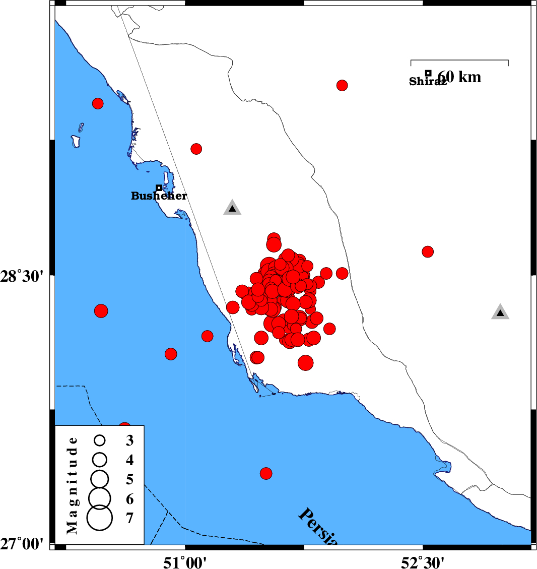 2013/04/10 19:41:57.5 00:11:57.5 28.4551.5530 ML:3.9 Bushehr Province, 28 km South-East of Khormog