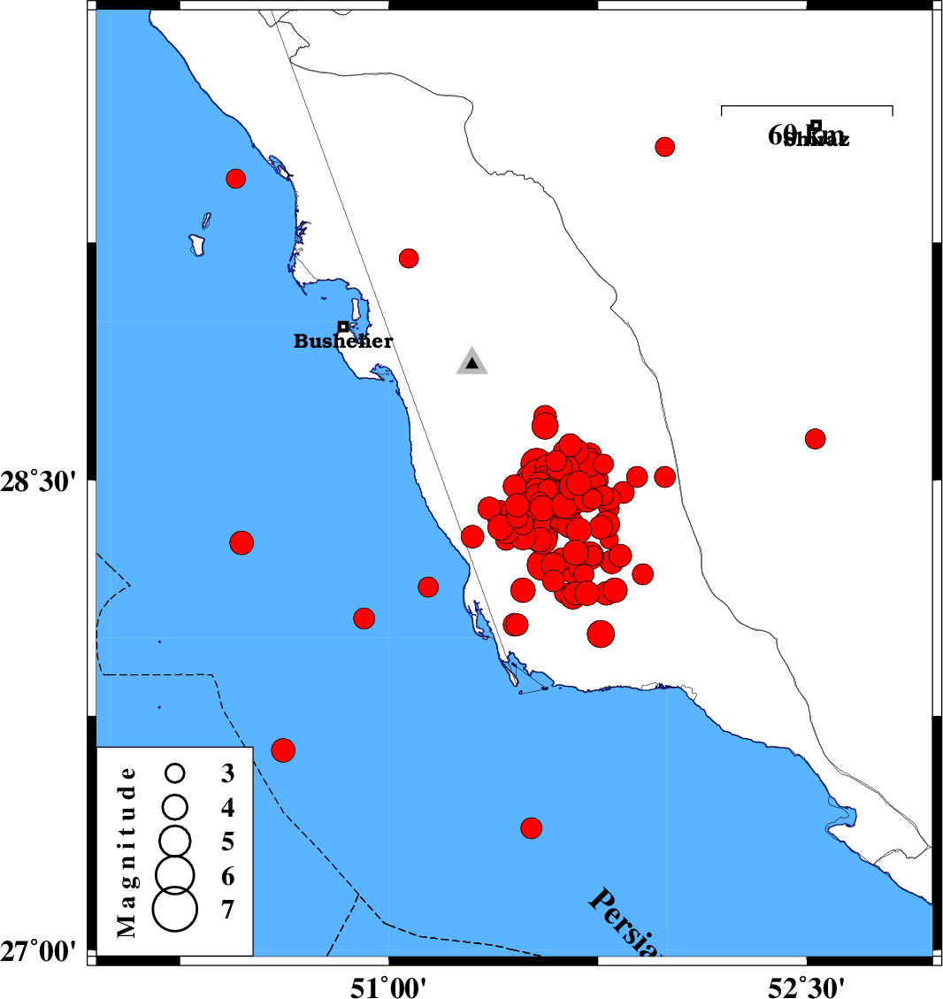 2013/04/10 19:41:57.5 00:11:57.5 28.4551.5530 ML:3.9 Bushehr Province, 28 km South-East of Khormog