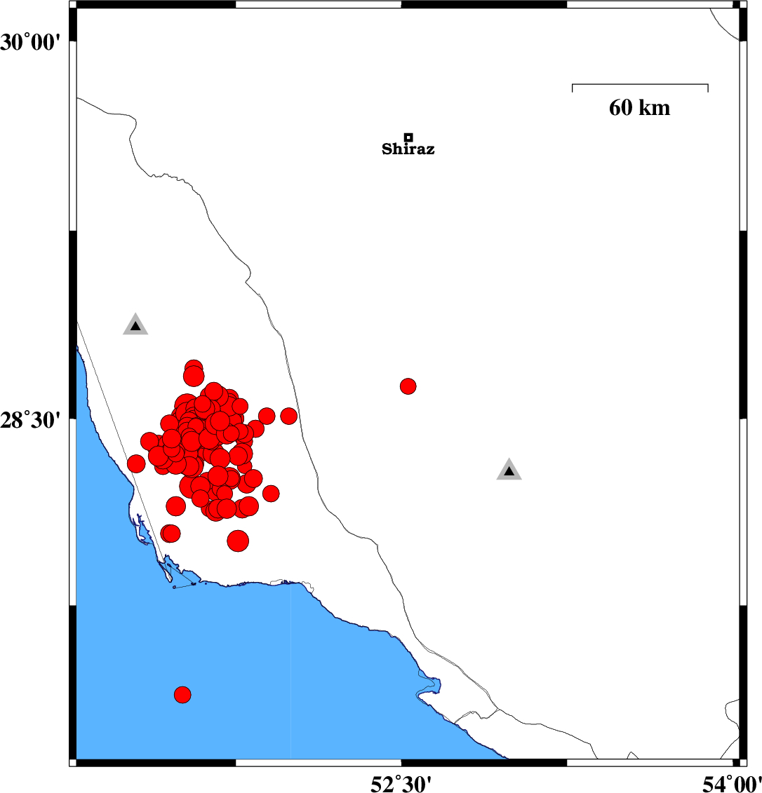 2013/04/14 | 12:32:18.2 | 17:02:18.2 | 28.15 | 51.81 | 29 | ML:3.9 | Bushehr Province, 43 km North-West of Bandar-e kangan | ||