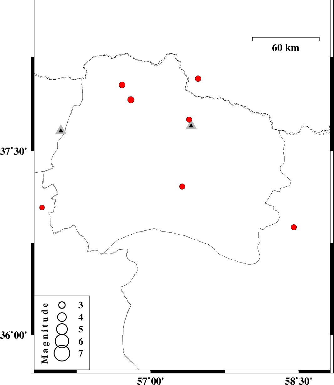 | 2013/04/10 | 05:53:59.6 | 10:23:59.6 | 37.75 | 57.39 | 15 | ML:2.6 | Khorasan(north) Province, 32 km North of Bojnurd | ||
