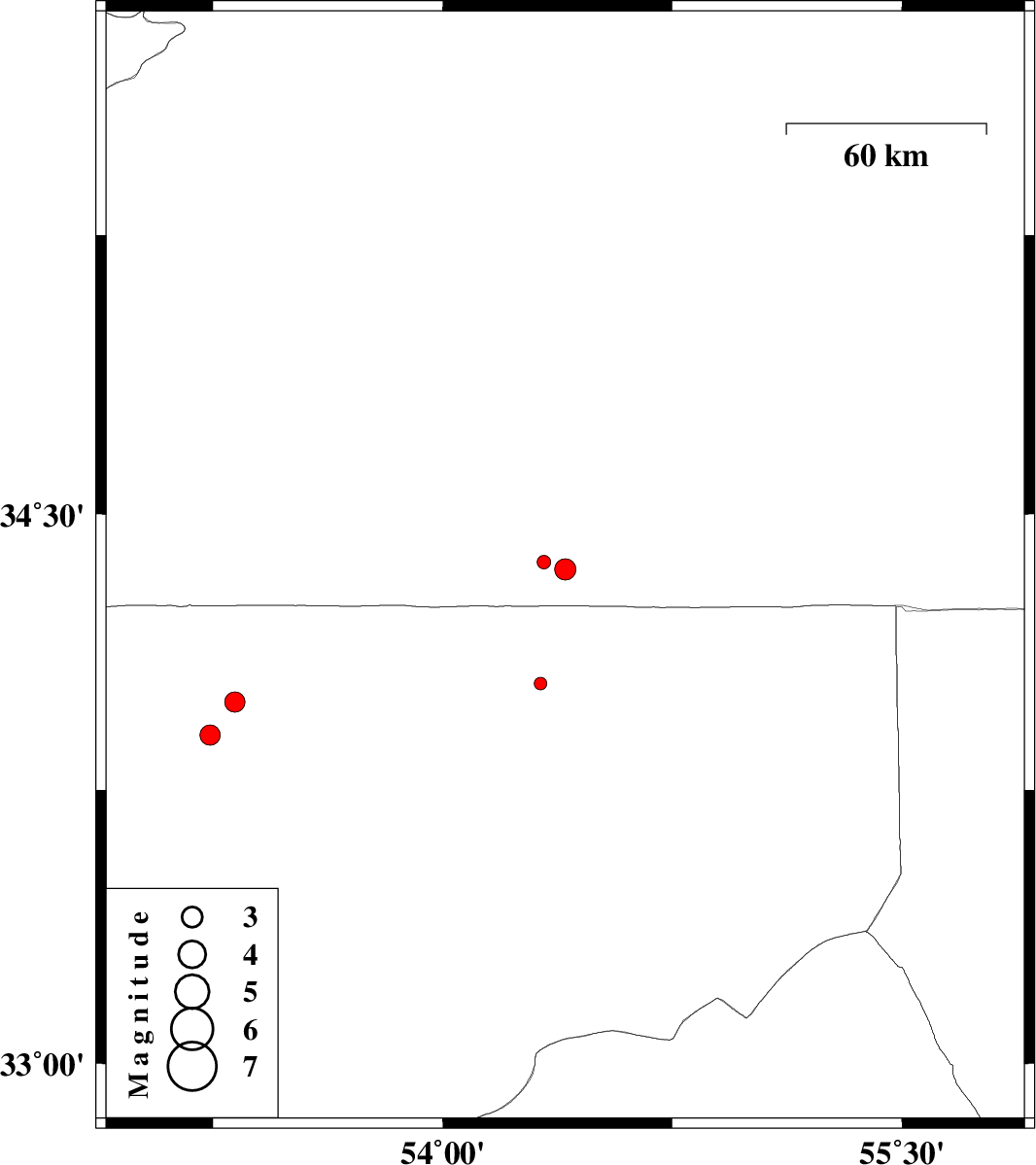 | 2013/03/24 | 14:52:02.5 | 19:22:02.5 | 33.99 | 53.32 | 14 | ML:3 | Esfahan Province, 126 km North-East of Nain |