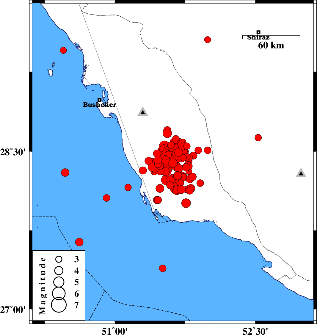 2013/04/12 | 12:59:37.5 | 17:29:37.5 | 28.47 | 51.57 | 30 | ML:3.2 | Bushehr Province, 28 km South-East of Khormog | ||