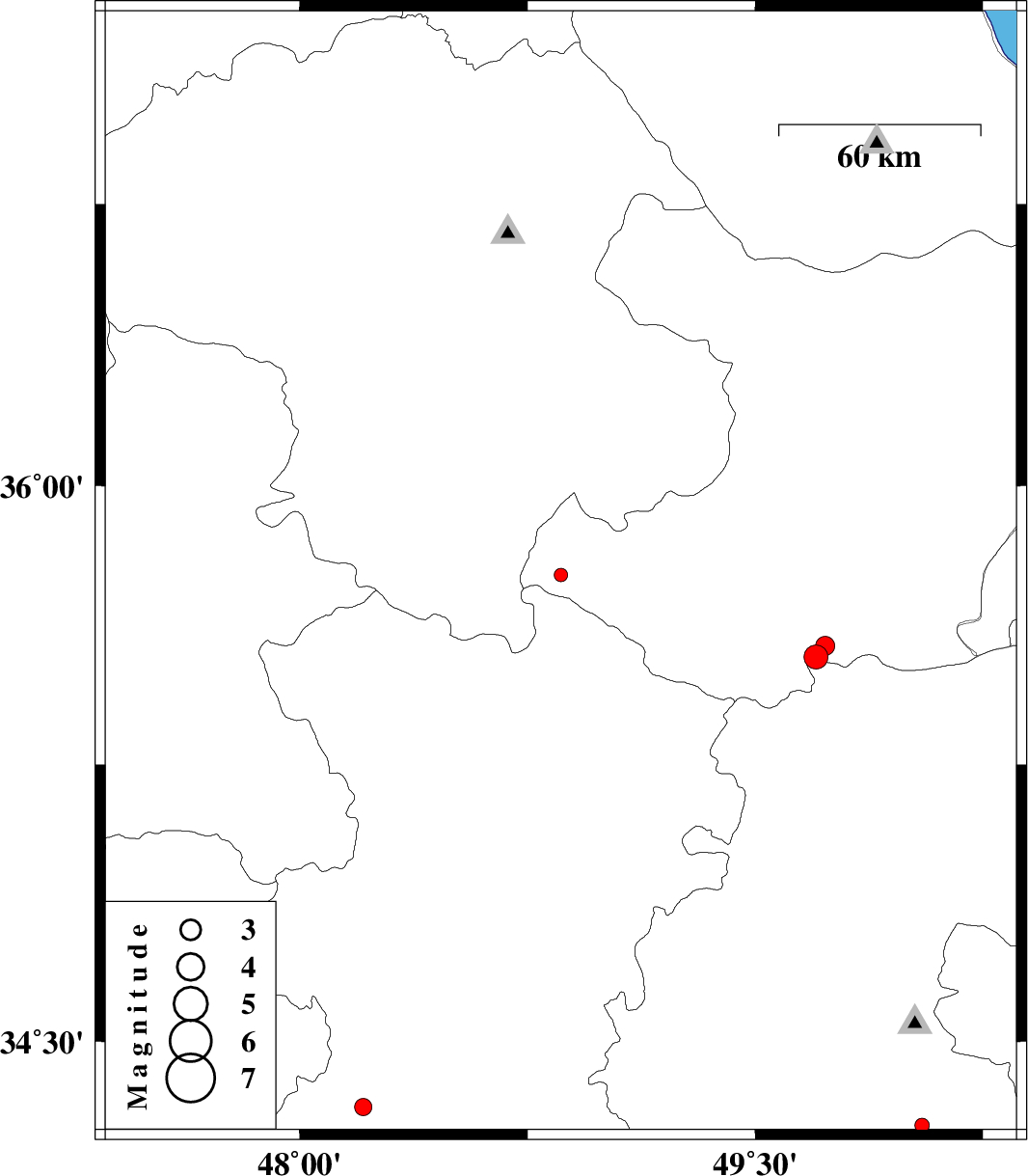 | 2013/04/02 | 16:10:41.2 | 20:40:41.2 | 35.57 | 49.73 | 15 | ML:2.8 | Ghazvin Province, 55 km South of Takestan |