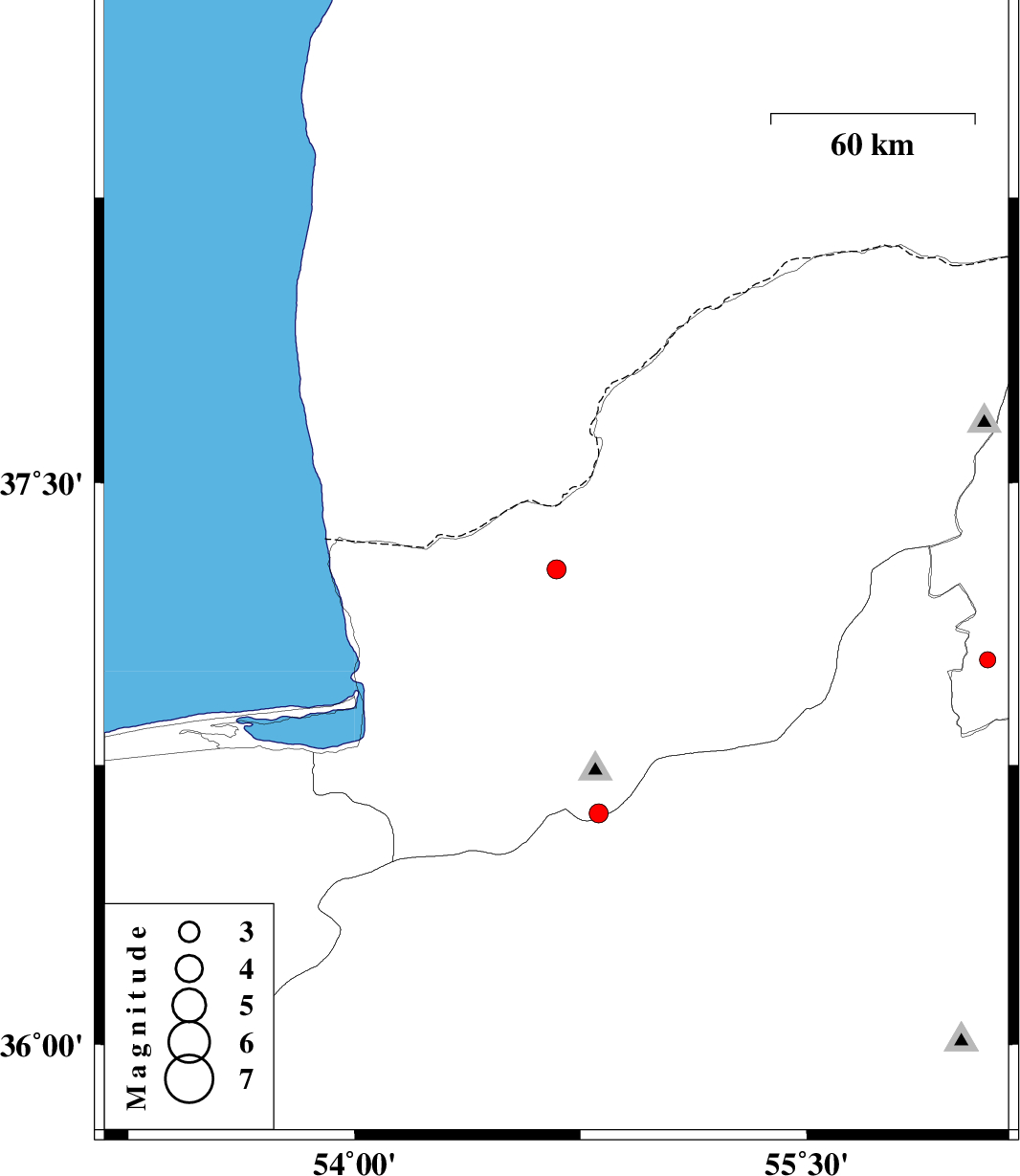 | 2013/04/14 | 14:04:30.8 | 18:34:30.8 | 36.62 | 54.81 | 14 | ML:2.8 | Golestan Province, 33 km South of Ali Abad |