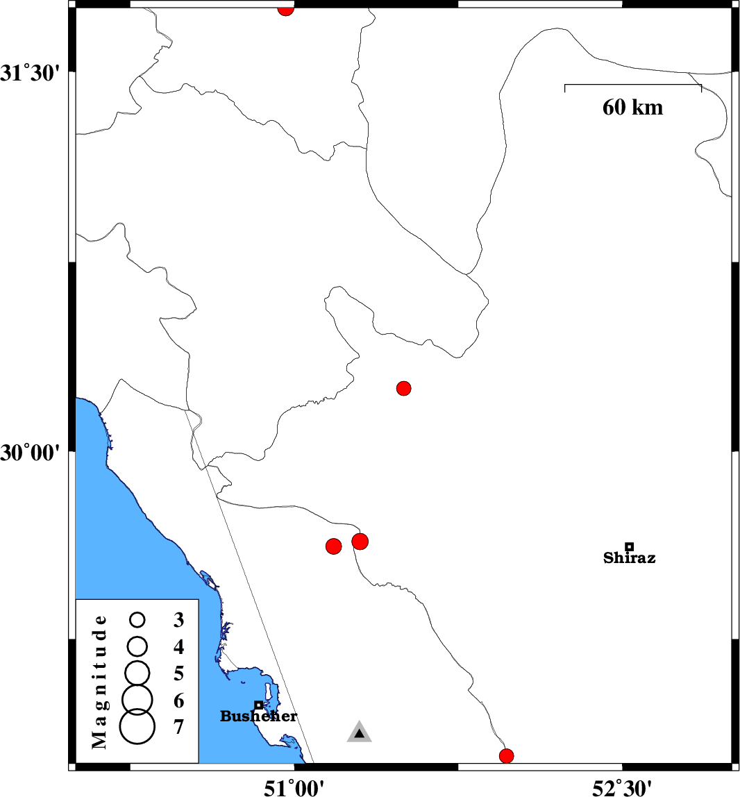 | 2013/04/19 | 15:44:12.6 | 20:14:12.6 | 28.78 | 51.97 | 17 | ML:3 | Bushehr Province, 16 km West of Farashband | ||
