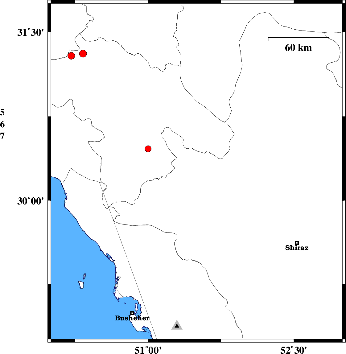 2013/04/17 | 19:32:30.7 | 00:02:30.7 | 29.64 | 51.3 | 14 | ML:3.4 | Fars Province, 34 km West of Kazerun |