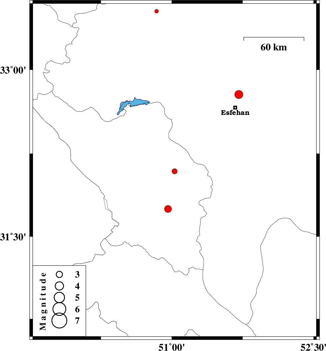 | 2013/04/19 | 20:22:34.6 | 00:52:34.6 | 32.78 | 51.71 | 14 | ML:4 | Esfahan Province, 13 km North of Esfahan | ||