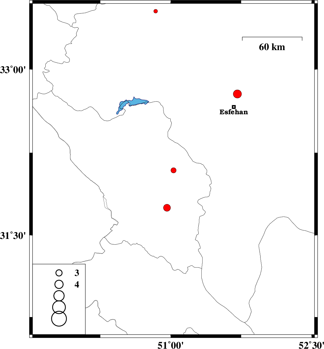 2013/04/19 | 20:22:34.6 | 00:52:34.6 | 32.78 | 51.71 | 14 | ML:4 | Esfahan Province, 13 km North of Esfahan | ||