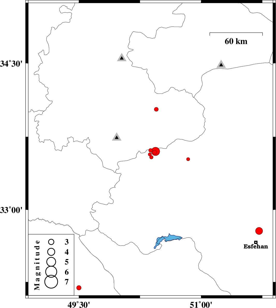 2013/04/24 | 03:08:25.3 | 07:38:25.3 | 33.6 | 50.44 | 9 | ML:4.6 | Esfahan Province, 21 km North-East of Golpayegan | ||