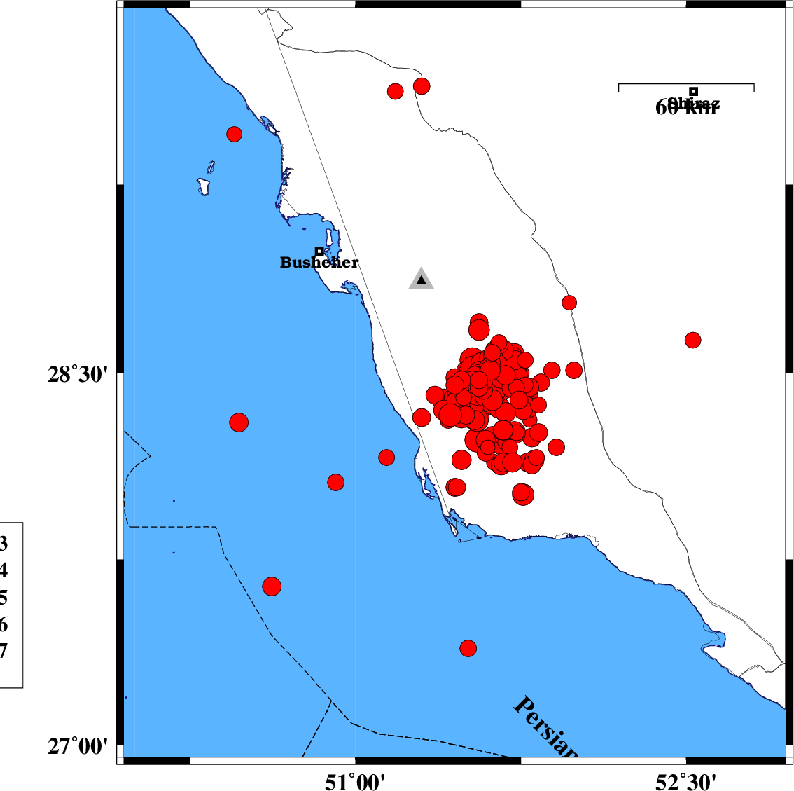 2013/04/11 | 02:03:22.7 | 06:33:22.7 | 28.36 | 51.49 | 27 | ML:4.9 | Bushehr Province, 34 km South-East of Khormog | ||