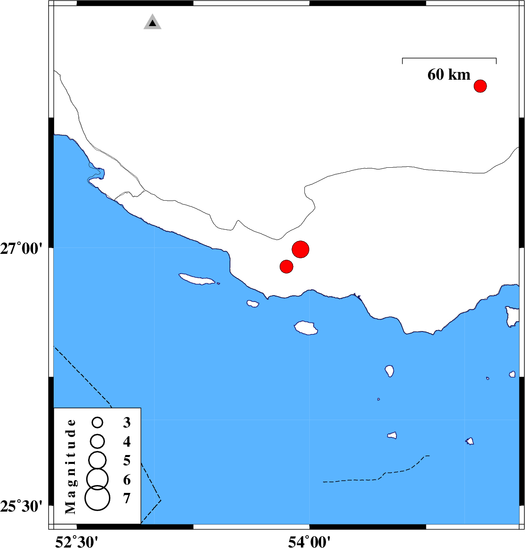 2013/04/25 | 22:56:32.3 | 03:26:32.3 | 26.89 | 53.85 | 42 | ML:3.8 | Hormozgan Province, 61 km South-West of Bastak | ||