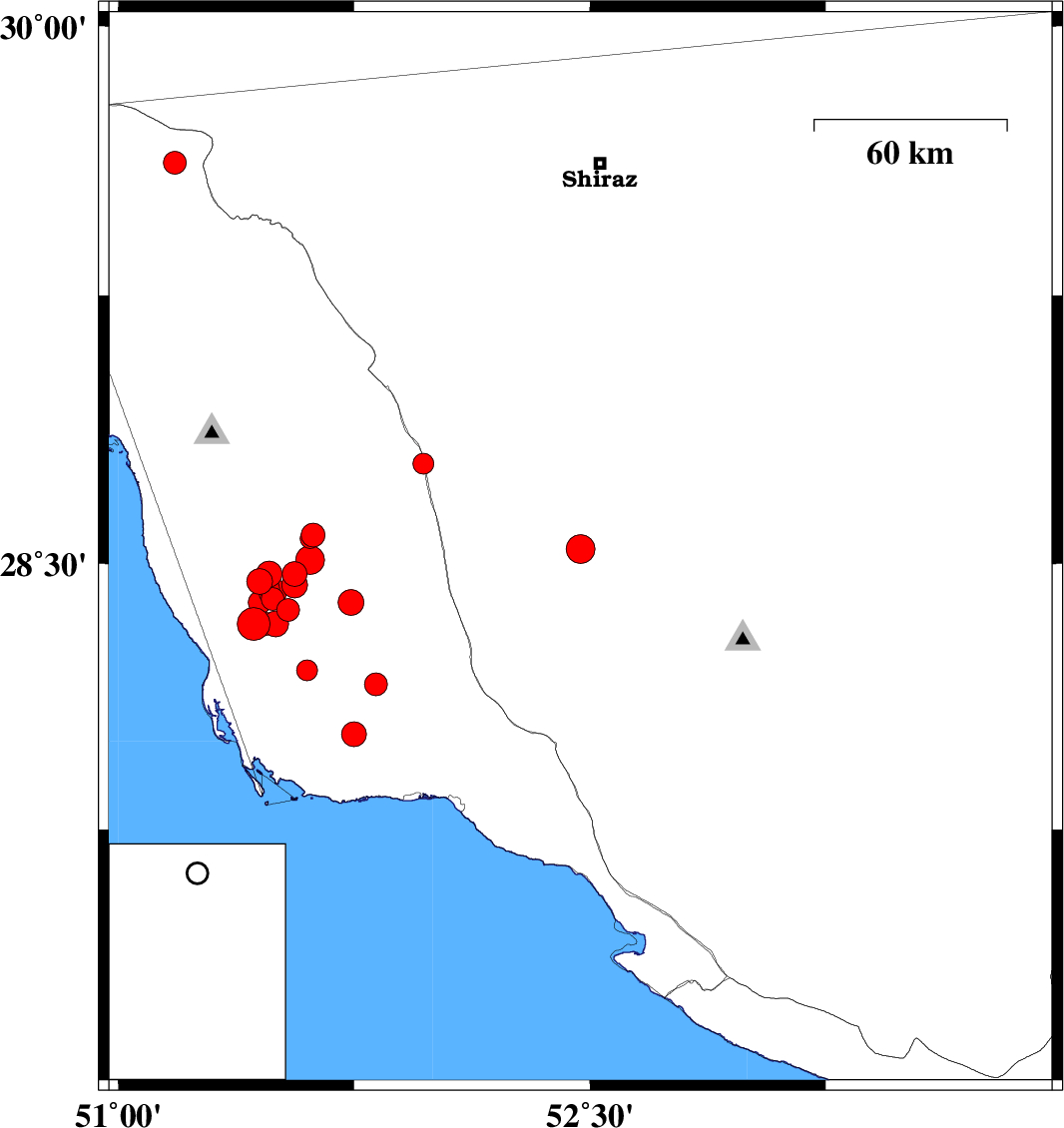 2013/04/20 | 00:58:31.4 | 05:28:31.4 | 28.43 | 51.48 | 34 | ML:3 | Bushehr Province, 26 km South-East of Khormog | ||