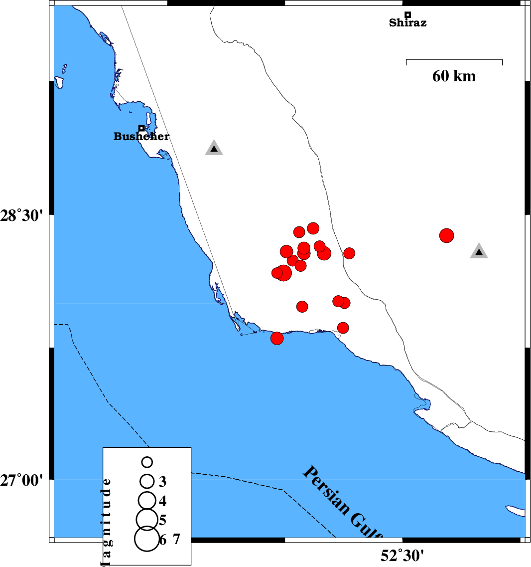 2013/04/27 | 20:43:58.4 | 01:13:58.4 | 28.33 | 51.39 | 25 | ML:3.1 | Bushehr Province, 36 km South of Khormog | ||