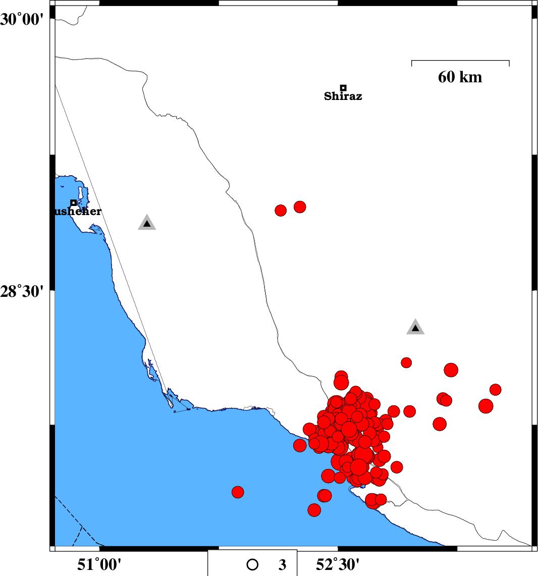 2013/04/09 | 19:51:36.4 | 00:21:36.4 | 28.4 | 51.52 | 28 | ML:3.5 | Bushehr Province, 32 km South-East of Khormog | ||