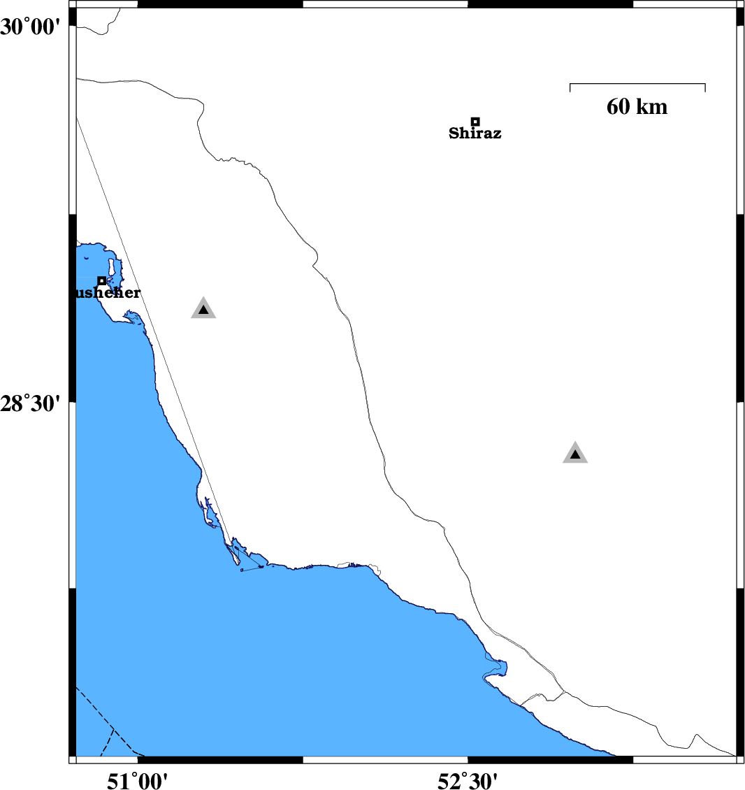2013/05/02 | 00:35:42.2 | 05:05:42.2 | 28.2 | 51.67 | 17 | ML:4.8 | Bushehr Province, 58 km South-East of Khormog | ||