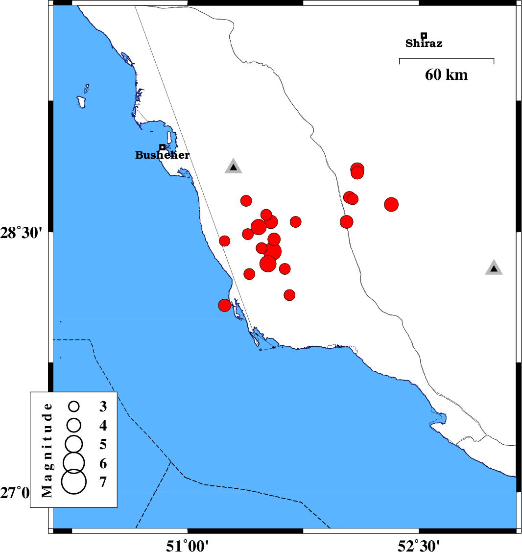 2013/04/27 | 20:43:58.4 | 01:13:58.4 | 28.33 | 51.39 | 25 | ML:3.1 | Bushehr Province, 36 km South of Khormog | ||