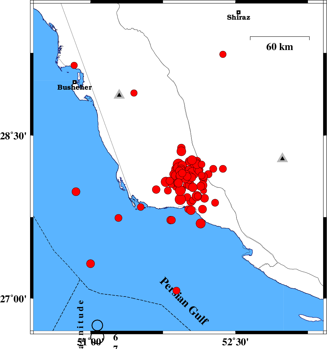 2013/04/10 19:41:57.5 00:11:57.5 28.4551.5530 ML:3.9 Bushehr Province, 28 km South-East of Khormog