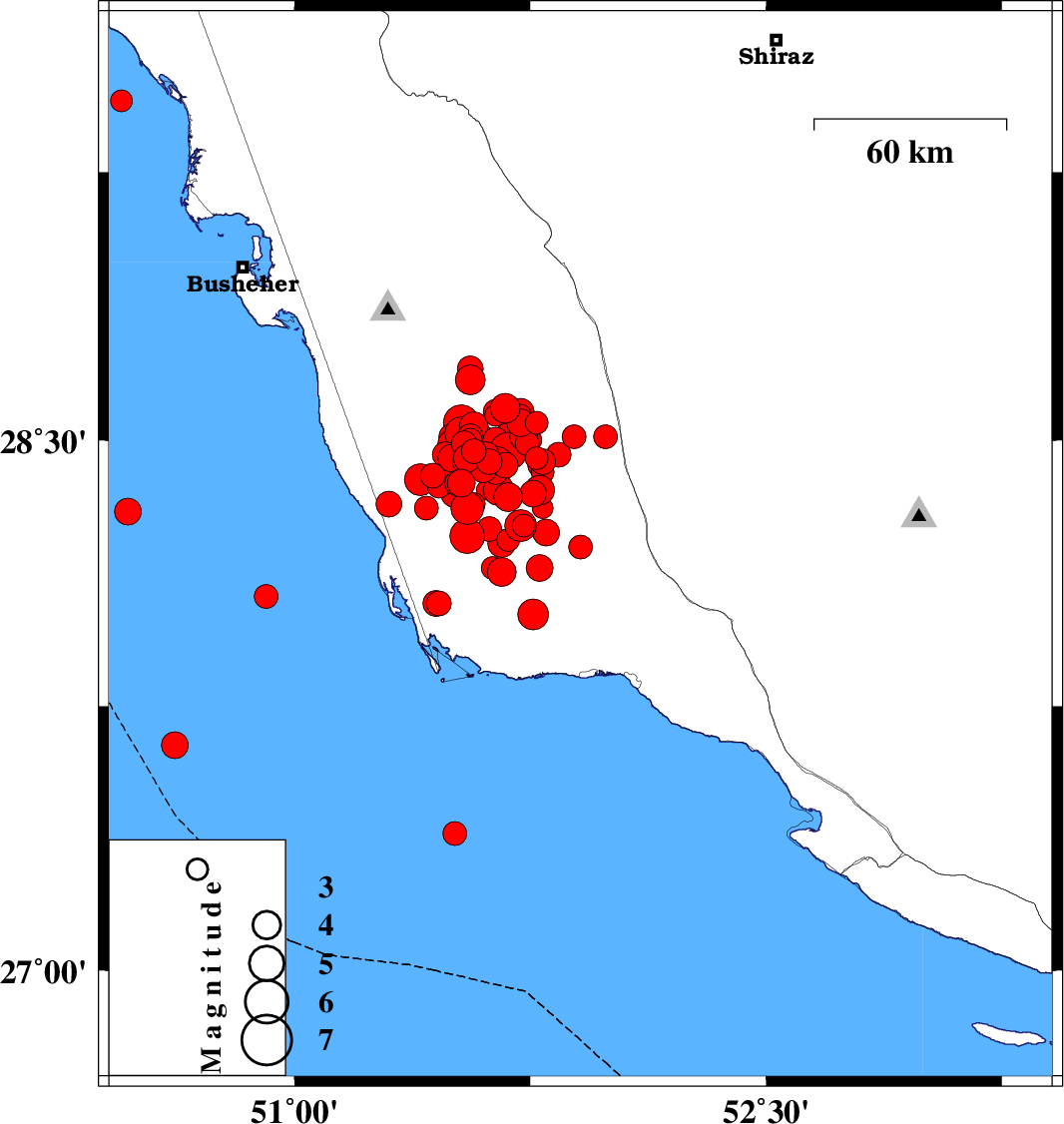 2013/04/10 | 09:10:58.7 | 13:40:58.7 | 28.46 | 51.61 | 14 | ML:3.6 | Bushehr Province, 32 km South-East of Khormog | ||