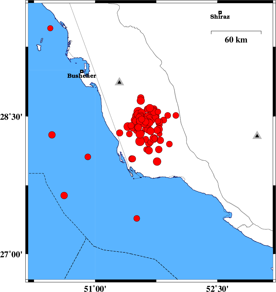 2013/04/10 | 09:10:58.7 | 13:40:58.7 | 28.46 | 51.61 | 14 | ML:3.6 | Bushehr Province, 32 km South-East of Khormog | ||