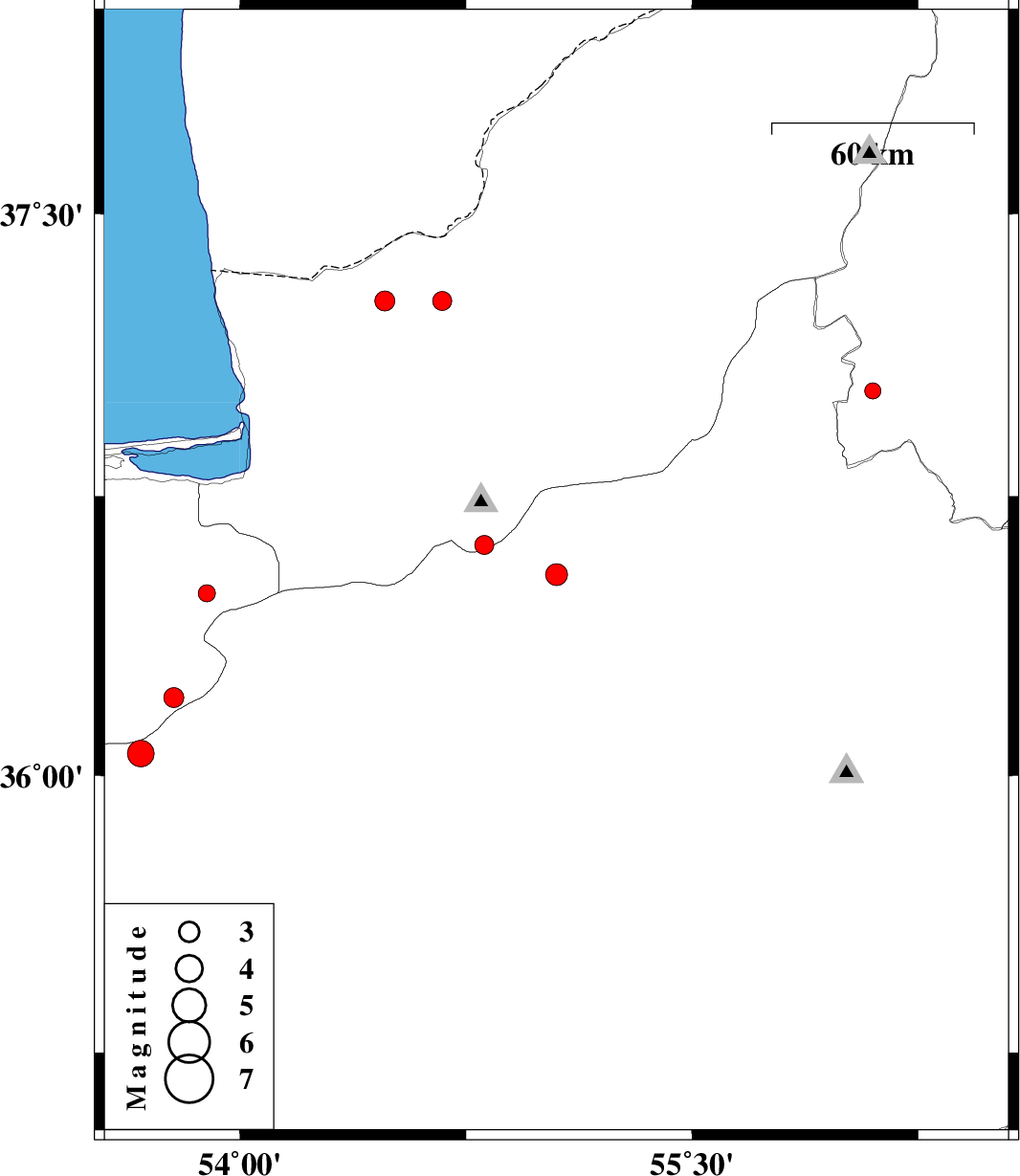 | 2013/04/10 | 01:29:36.8 | 05:59:36.8 | 36.06 | 53.67 | 15 | ML:3.9 | Semnan Province, 55 km East of Pol-E-Sefid | ||