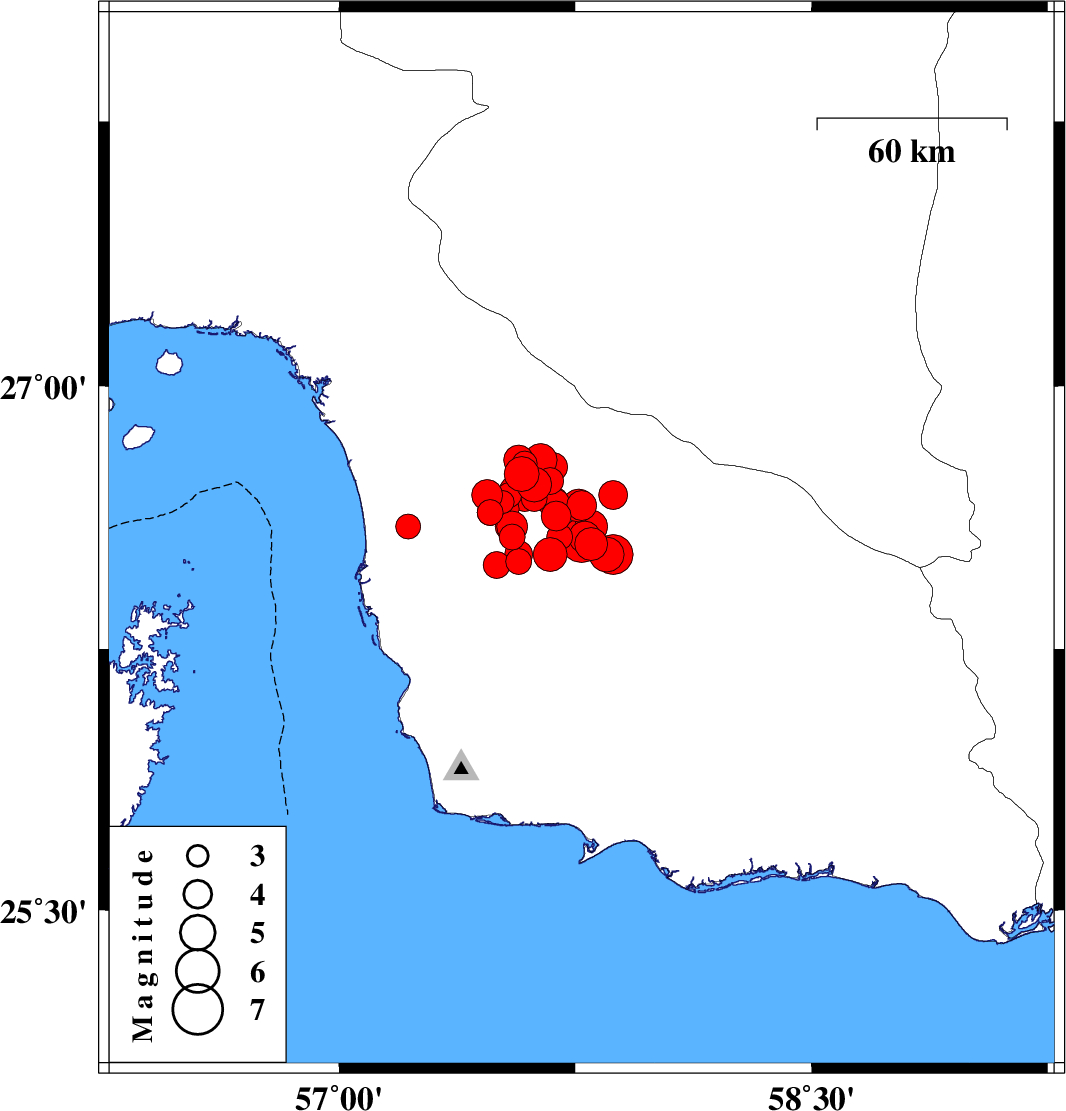 2013/05/11 22:23:05.8 02:53:05.8 26.7557.5814 ML:5 Hormozgan Province, 74 km South of Manujan