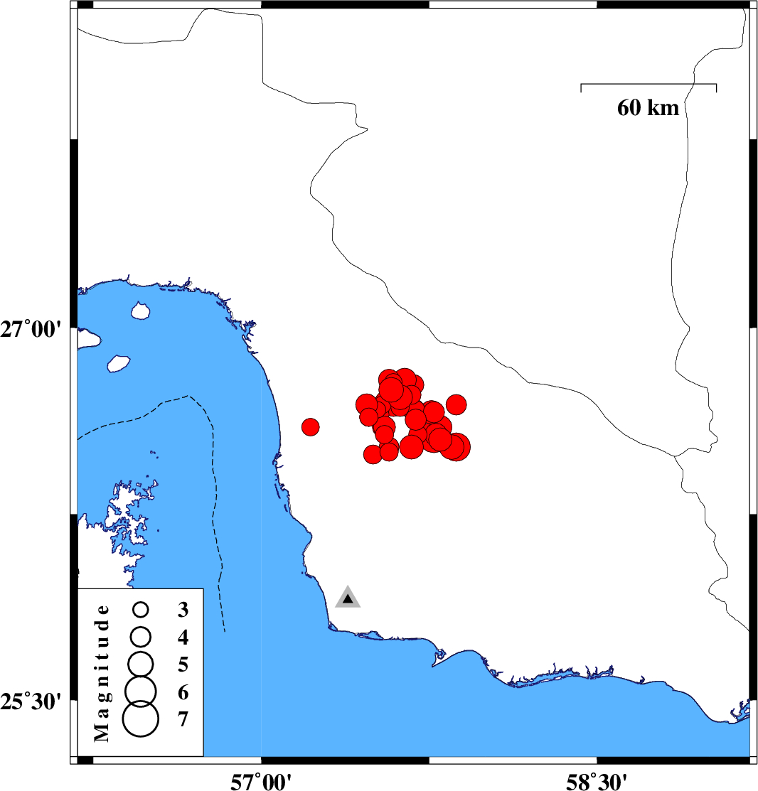 2013/05/11 03:58:14.1 08:28:14.1 26.7757.6815 ML:4.1 Hormozgan Province, 73 km South-East of Manujan