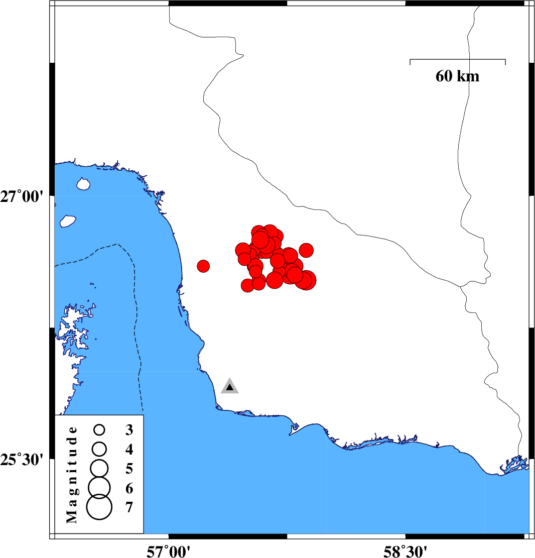 2013/05/11 03:58:14.1 08:28:14.1 26.7757.6815 ML:4.1 Hormozgan Province, 73 km South-East of Manujan