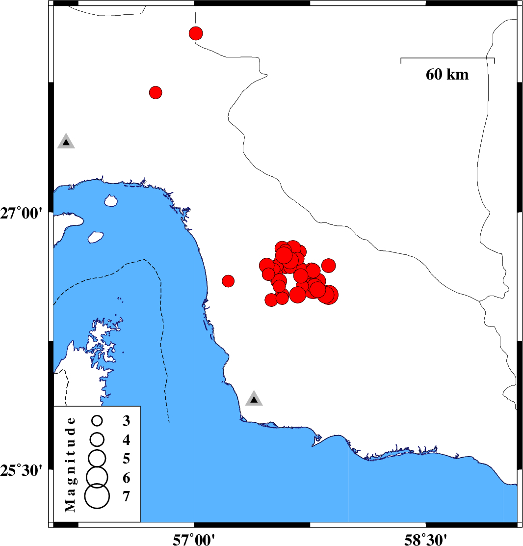 2013/05/11 22:23:05.8 02:53:05.8 26.7557.5814 ML:5 Hormozgan Province, 74 km South of Manujan