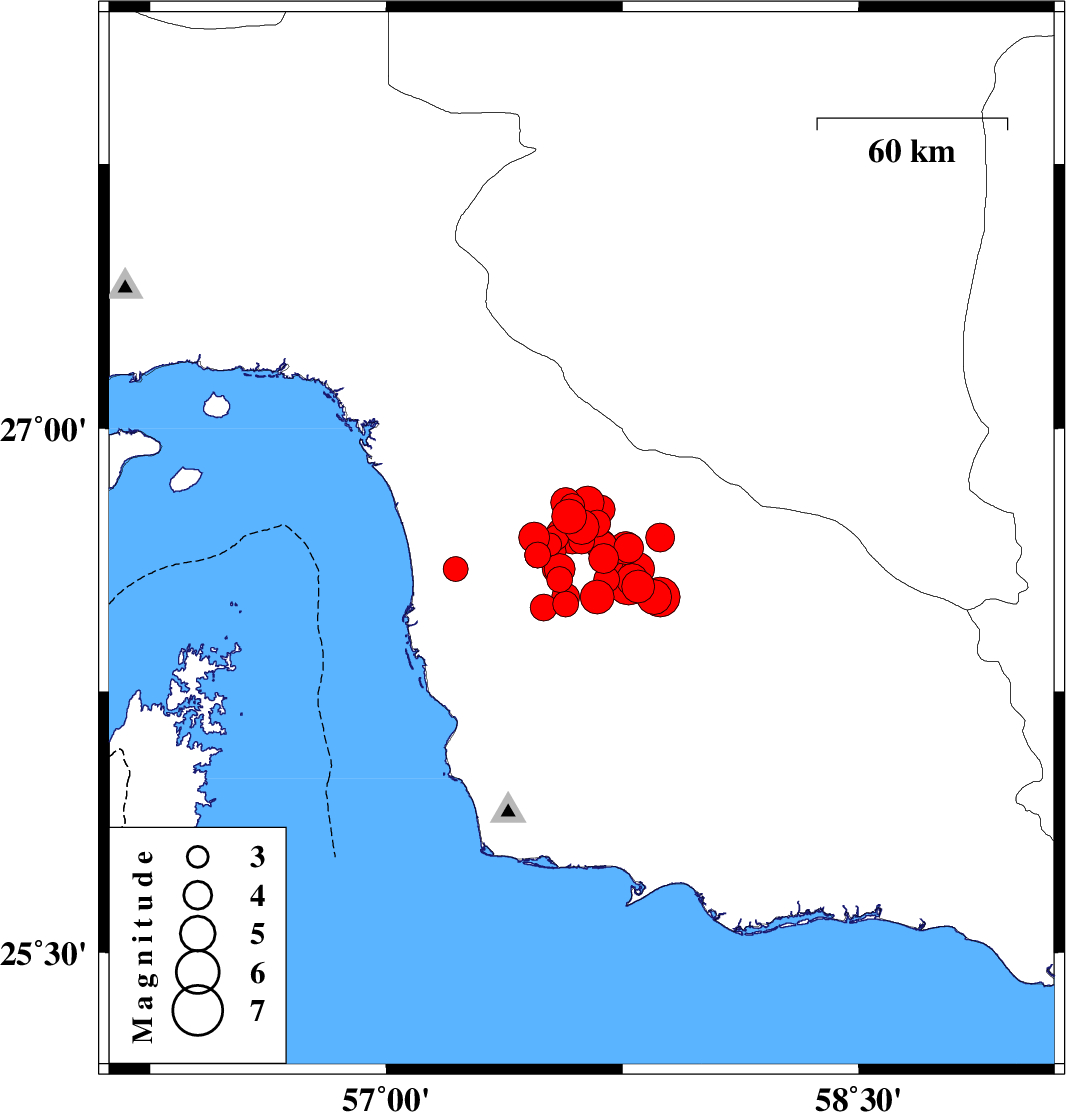2013/05/11 22:23:05.8 02:53:05.8 26.7557.5814 ML:5 Hormozgan Province, 74 km South of Manujan