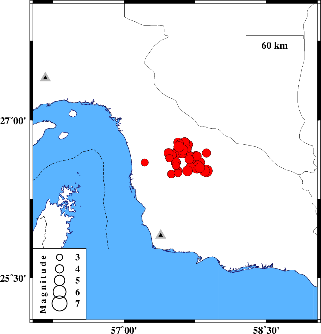 2013/05/11 22:23:05.8 02:53:05.8 26.7557.5814 ML:5 Hormozgan Province, 74 km South of Manujan