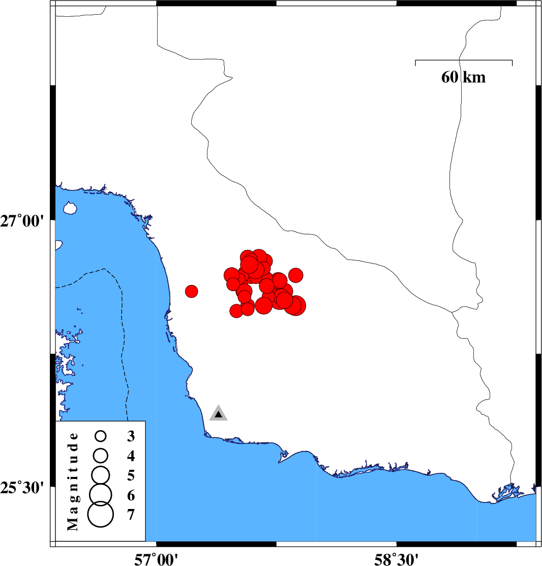 2013/05/11 03:58:14.1 08:28:14.1 26.7757.6815 ML:4.1 Hormozgan Province, 73 km South-East of Manujan