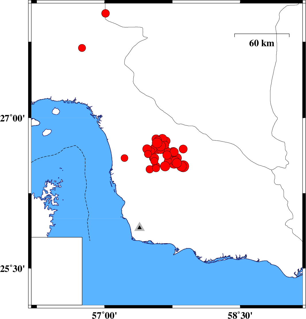 2013/05/11 22:23:05.8 02:53:05.8 26.7557.5814 ML:5 Hormozgan Province, 74 km South of Manujan