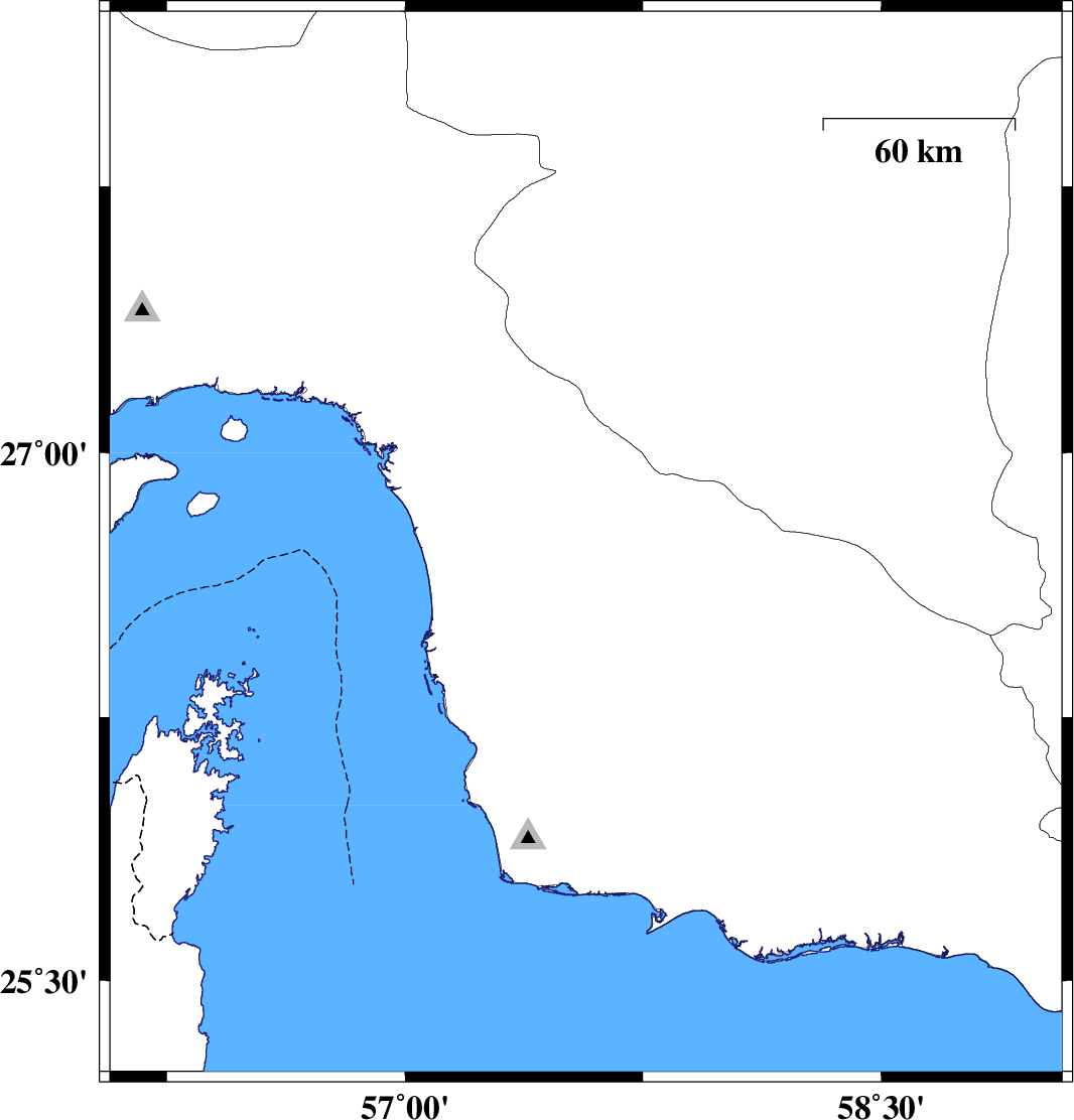 2013/05/12 | 02:54:34.5 | 07:24:34.5 | 26.36 | 57.41 | 14 | ML:3.5 | Hormozgan Province, 88 km North-West of Jask | ||