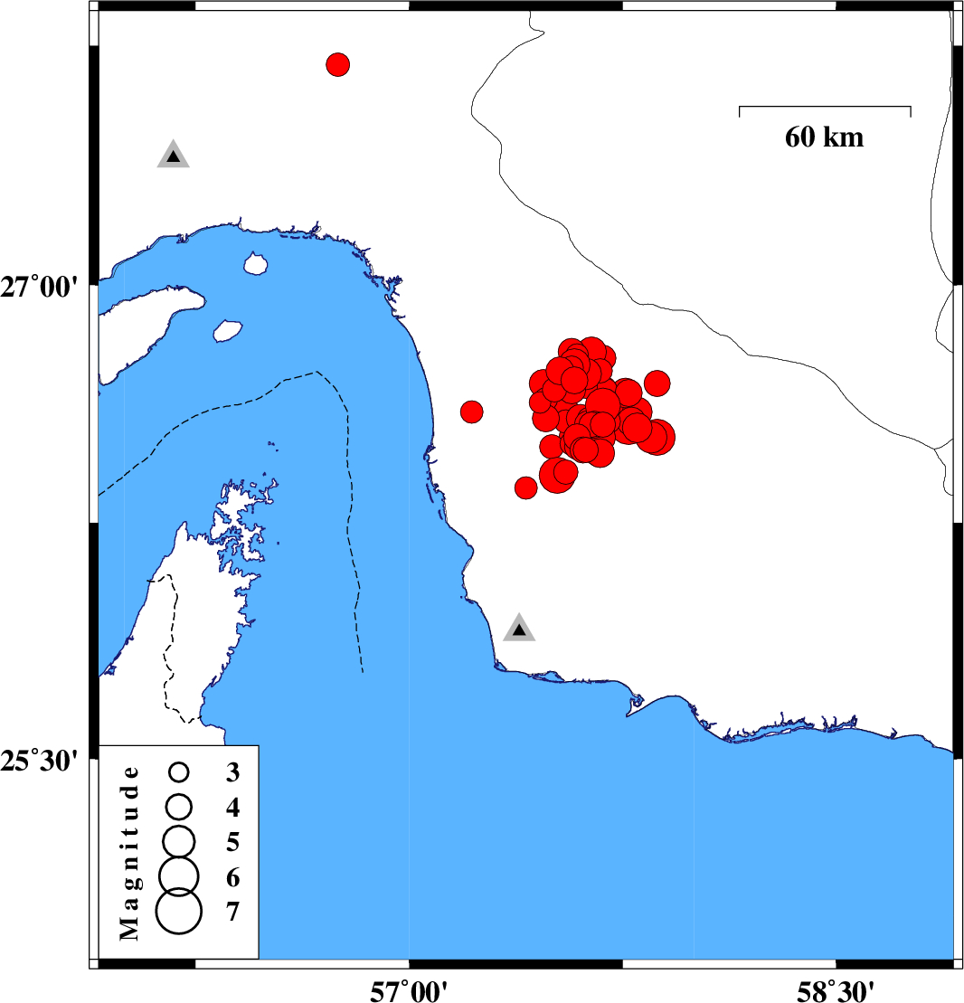 2013/05/11 03:58:14.1 08:28:14.1 26.7757.6815 ML:4.1 Hormozgan Province, 73 km South-East of Manujan