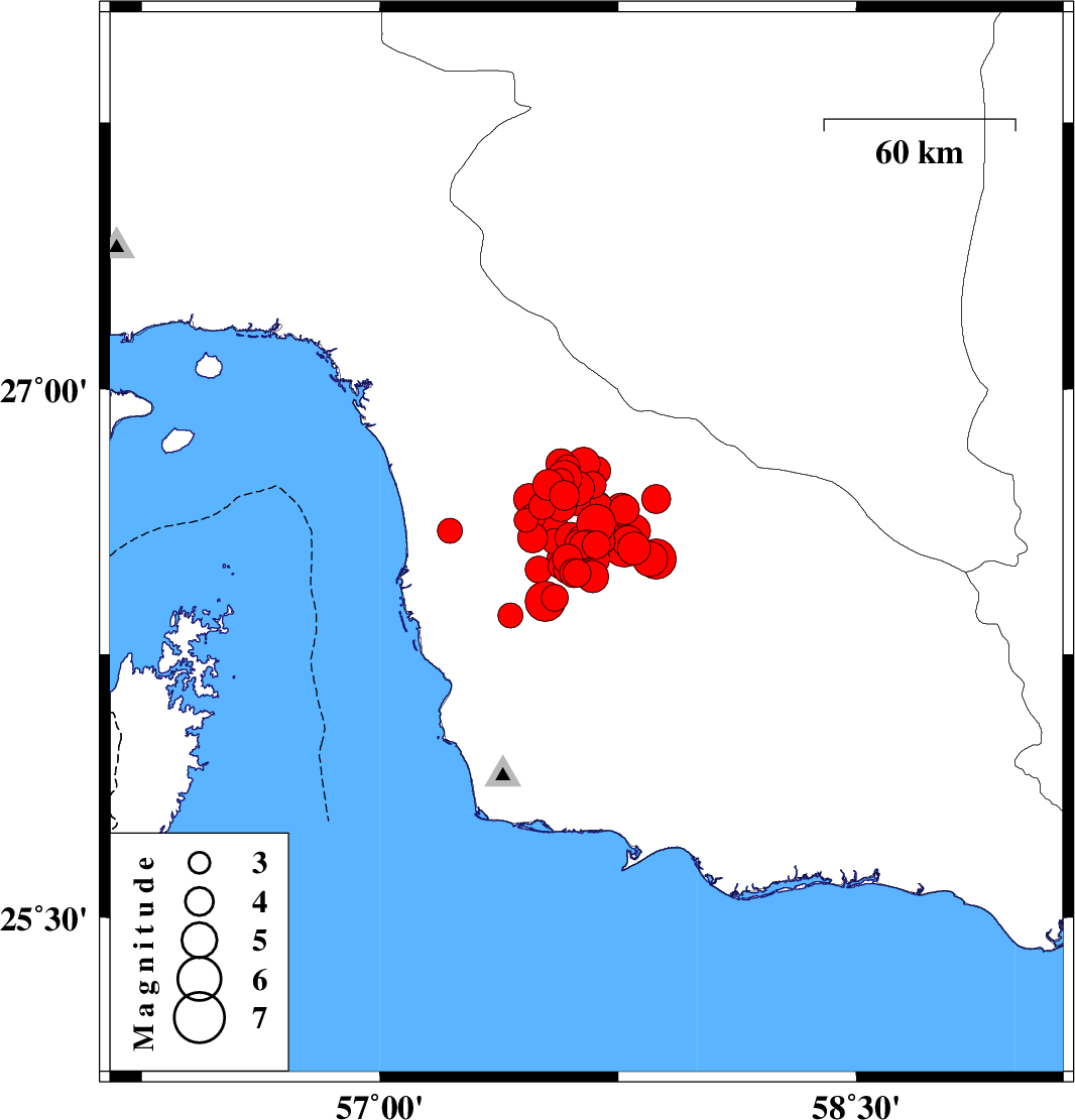 2013/05/11 22:28:08.5 02:58:08.5 26.6957.4714 ML:4.4 Hormozgan Province, 80 km South of Manujan