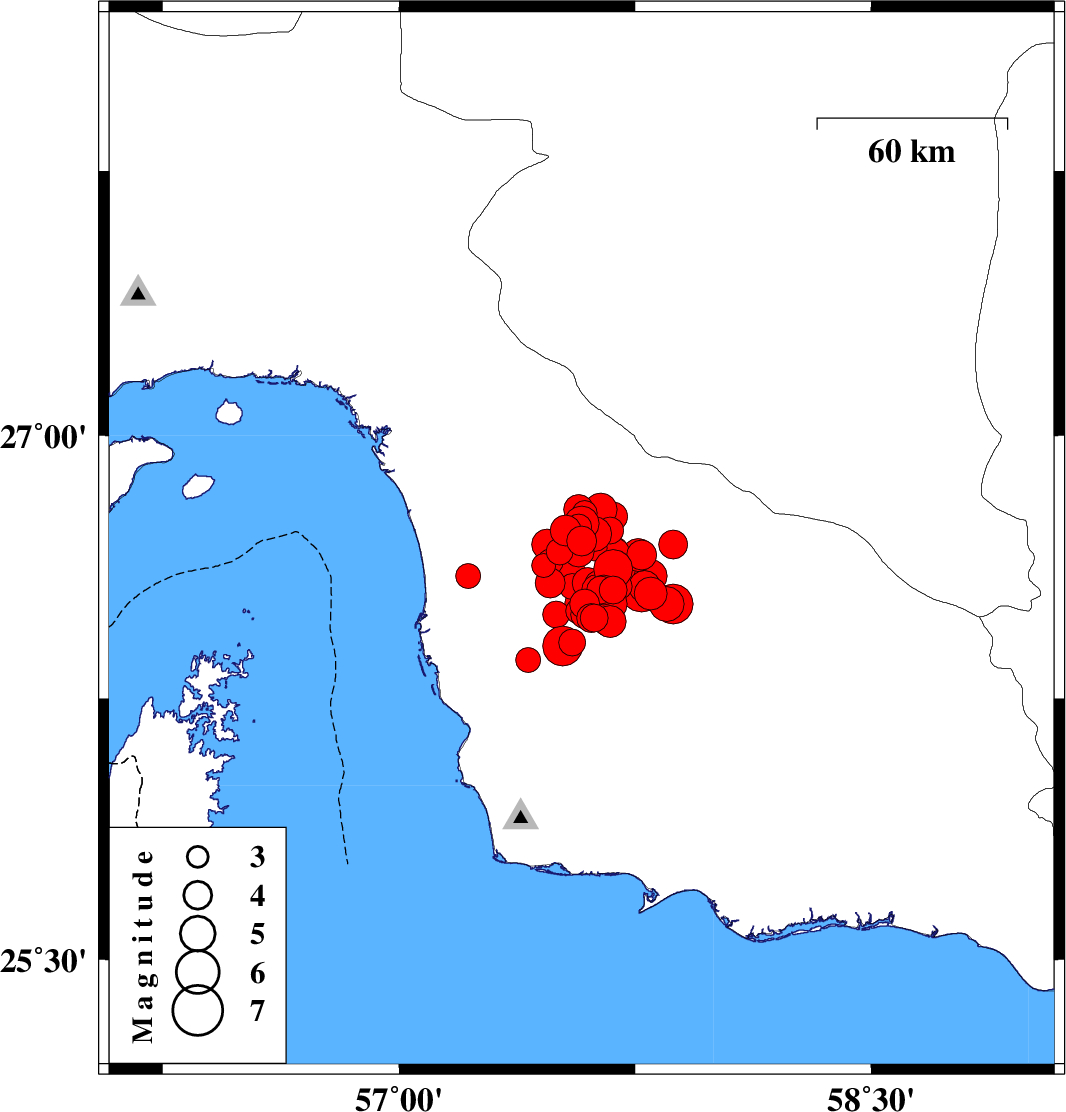 2013/05/11 | 02:08:08.5 | 06:38:08.5 | 26.56 | 57.77 | 15 | Ms:6.2 | Hormozgan Province, 103 km North of Jask | ||