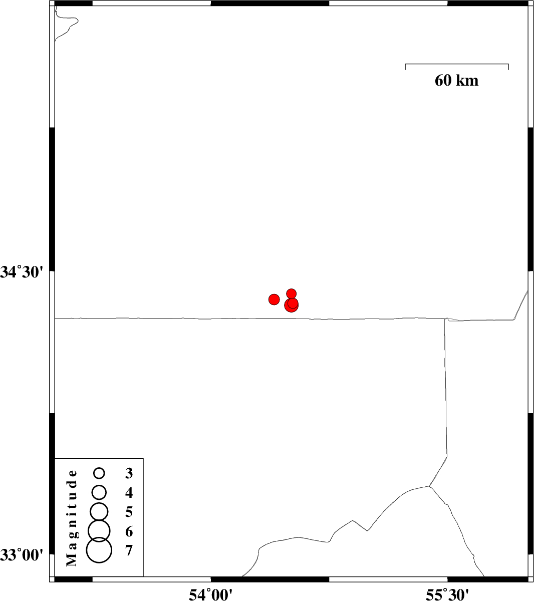 | 2013/05/07 | 20:23:00.3 | 00:53:00.3 | 34.32 | 54.51 | 14 | ML:4 | Semnan Province, 206 km South-East of Damghan | ||