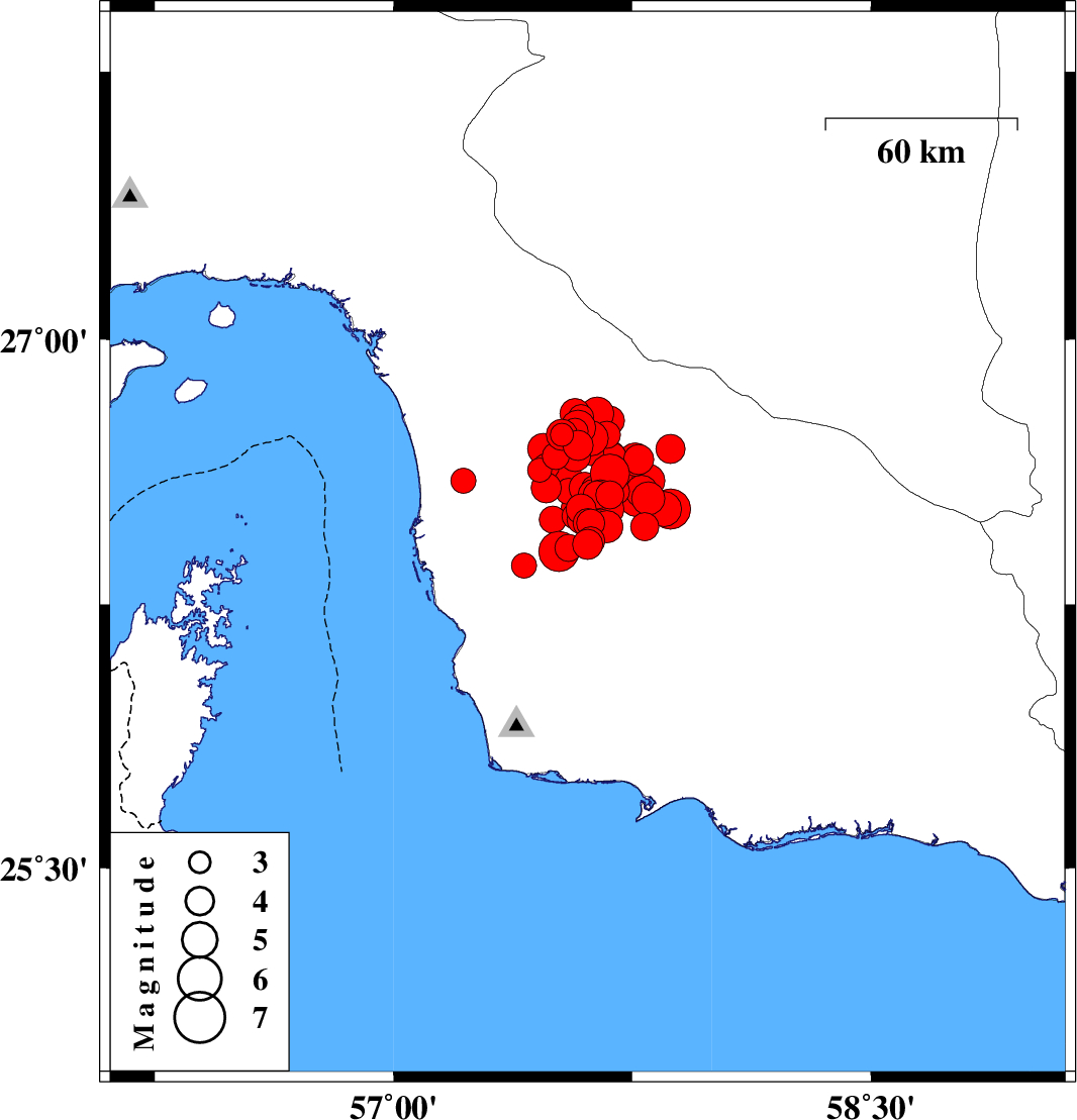 2013/05/11 22:23:05.8 02:53:05.8 26.7557.5814 ML:5 Hormozgan Province, 74 km South of Manujan