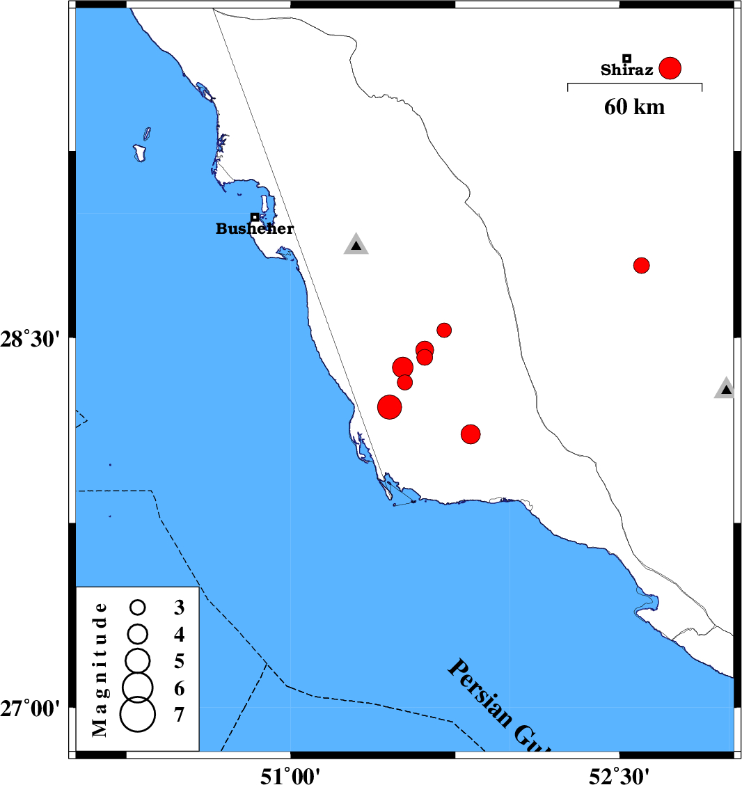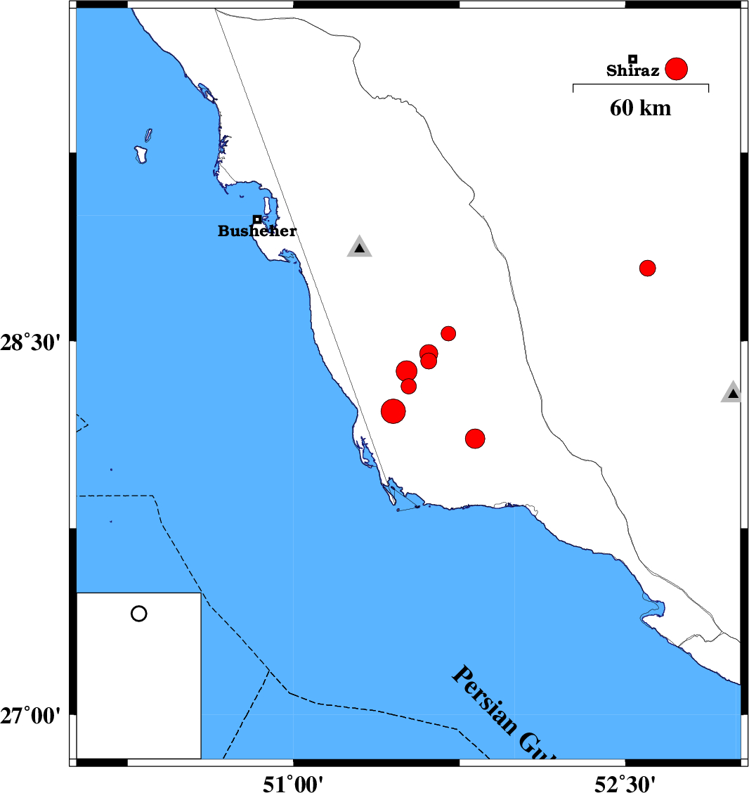 | 2013/05/09 | 03:29:37.2 | 07:59:37.2 | 28.11 | 51.82 | 31 | ML:4 | Bushehr Province, 39 km North-West of Bandar-e kangan | ||