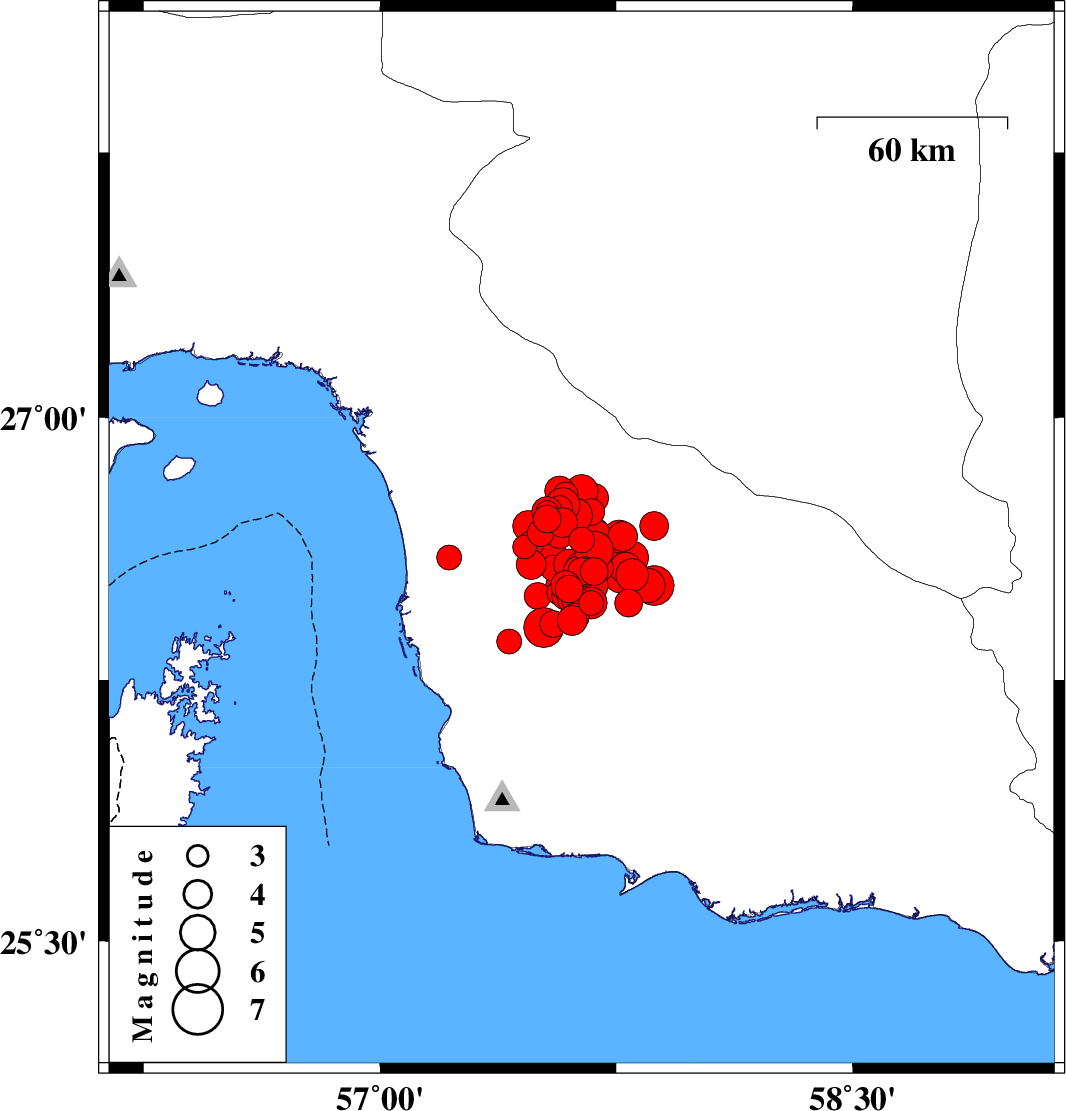 2013/05/14 10:02:36.7 14:32:36.7 26.5157.614 ML:4 Hormozgan Province, 100 km South-East of Manujan